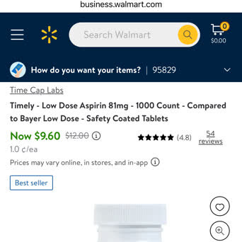 附图是美国沃尔玛的阿司匹林,1000片一瓶的低剂量阿司匹林,来自美国仿制药品牌Timely,每瓶零售价9.6刀,折合每片还不到1美分。